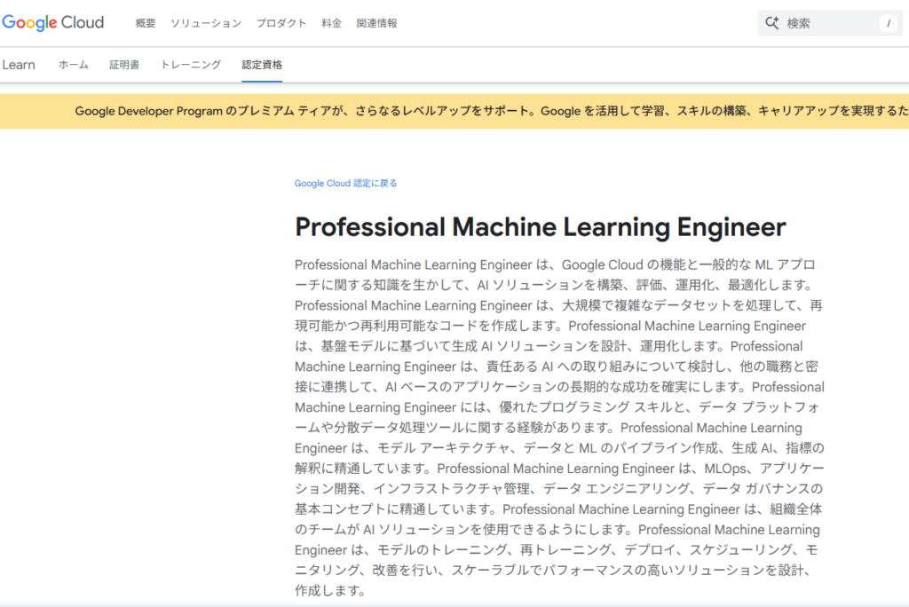 | Google Cloud Professional ML Engineer | Google Cloud | 約30,000円(200 USD) | 非公開 | 100〜200時間 |