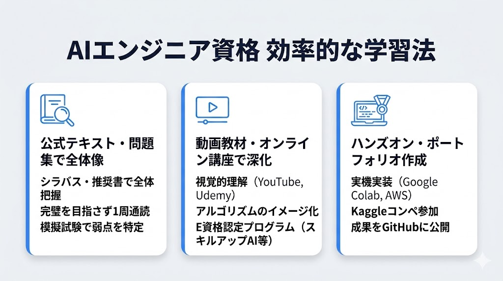AI資格の合格には、広範な知識のインプットと実践的なアウトプットのバランスが不可欠です。ここでは、効率的に学習を進めるための3つの方法を紹介します。