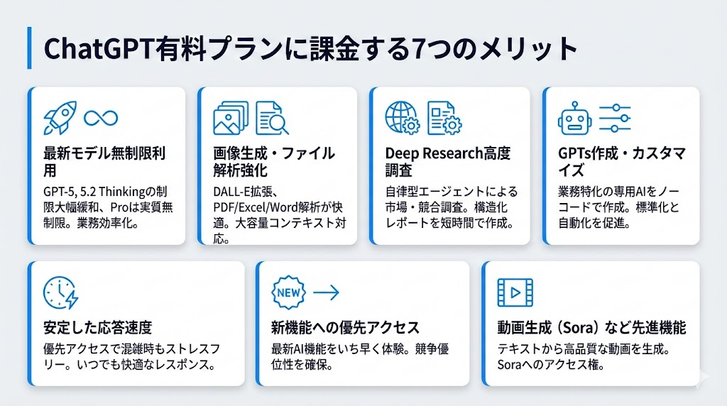 ChatGPTの有料プランに課金することで、無料版では体験できない多くのメリットが得られます。最新モデルの利用制限緩和、画像生成やファイル解析の強化、高度な調査機能、カスタマイズ性の向上など、業務効率化に直結する機能が充実しています。ここでは、課金によって得られる7つの具体的なメリットを詳しく解説します。