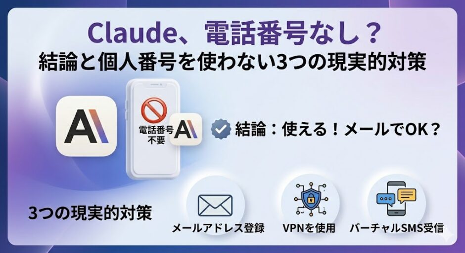 結論から言えば、Claudeの新規登録には電話番号が必須で、これをスキップする公式な手段はありません。ただし、個人番号を使わずに事業運用する方法は存在します。本記事ではAnthropic公式ヘルプセンターの情報をもとに、回避できる部分とできない部分を切り分け、ひとり社長が取れる3つの現実的な対策とやってはいけない方法、登録時のトラブル対処法までを整理します。