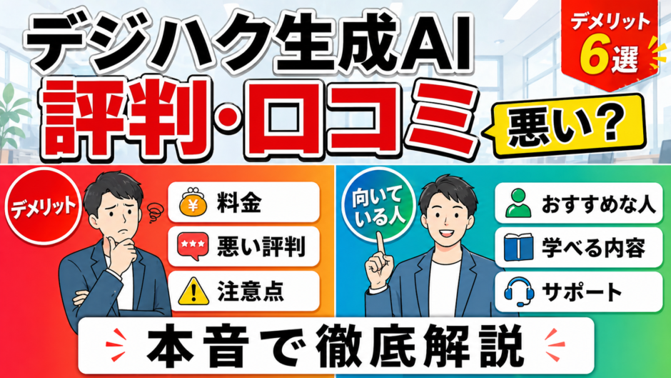 この記事では、デジハク生成AIの口コミを情報源別に検証した上で、料金の妥当性・回収シミュレーション・デメリット6選・他AIスクールとの比較・無料説明会で確認すべき質問まで、申し込み前の意思決定に必要な情報を一気に整理しました。「30万円を投じる価値があるか」を自分の目的と照らし合わせて判断するための材料として、最後までお役立てください。