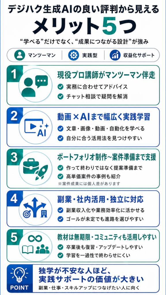 口コミ全体を踏まえると、デジハク生成AIの強みは「単に学べる」だけでなく「学びを成果に変える設計」にあります。以下の5点が、申し込みの後押しになりやすいメリットです。