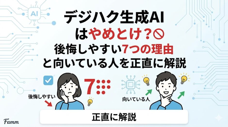 「デジハク生成AI やめとけ」と検索したあなたが知りたいのは、口コミの羅列ではなく「自分は申し込むべきか、見送るべきか」の判断材料のはずです。この記事では、料金・返金保証・案件支援の実態を公式情報ベースで整理し、合う人・合わない人の境界線、約30万円の受講料を回収できるかの試算、他スクールとの比較までまとめました。