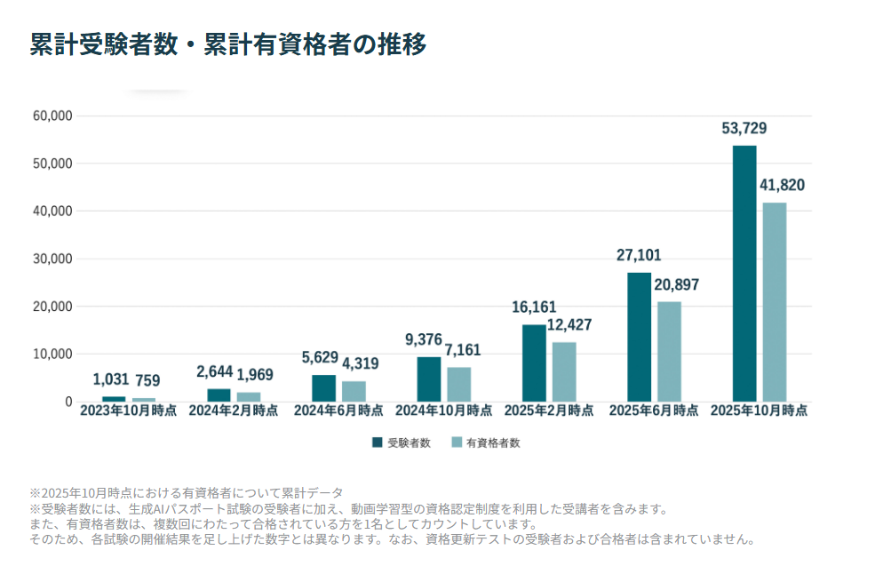 また、試験の開始が2023年10月と比較的新しく、人事担当者や採用責任者の間でも認知が十分に浸透していないのが現状です。GUGAの公式発表によると、累計受験者数は2025年10月時点で53,729名に達していますが、G検定(日本ディープラーニング協会)の累計受験者数15万人超と比べると、まだ発展途上の段階にあります。資格名を伝えても「何の資格ですか?」と聞き返される場面があり得ることは、受験を検討する段階で理解しておくべきポイントです。