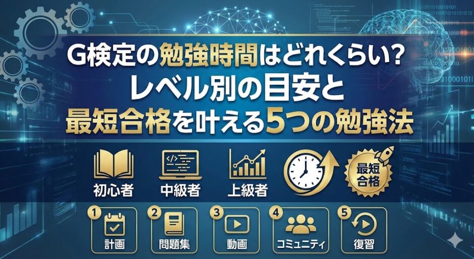 G検定(JDLA Deep Learning for GENERAL)は、AI・ディープラーニングの知識を体系的に証明できる人気資格です。累計合格者数は2025年に10万人を突破し、業種・職種を問わず受験者が増え続けています。しかし「自分のレベルだとどのくらい勉強すればいいのか」「仕事と両立しながら間に合うのか」と不安に感じる方も多いのではないでしょうか。この記事では、合格者の実データにもとづく勉強時間の目安から、レベル別の時間差が生まれる理由、無理のないスケジュール設計、よくある失敗の回避策、そして合格後のキャリア活用まで網羅的にお伝えします。