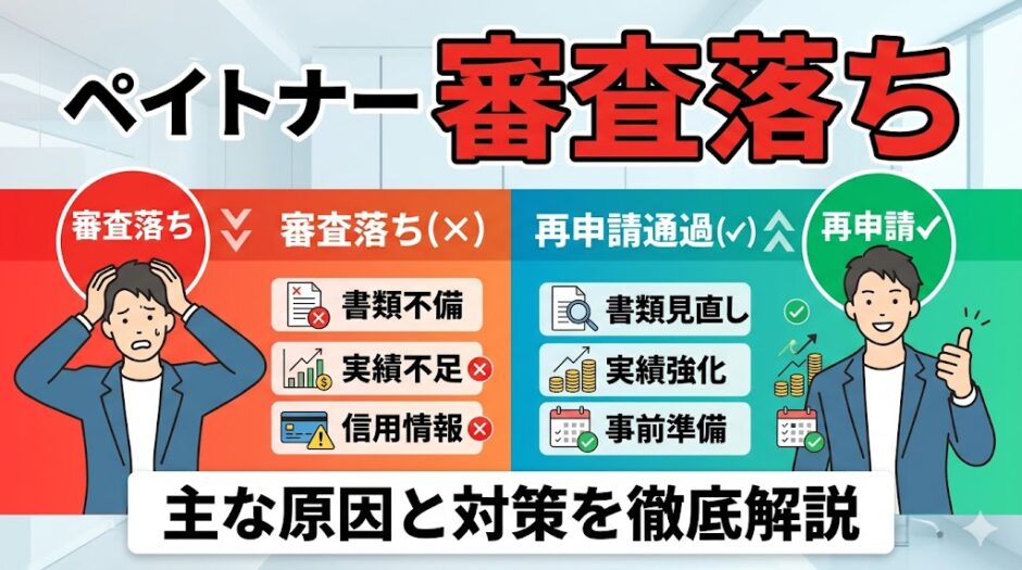 ペイトナーファクタリングに申し込んだものの審査落ちしてしまい、「なぜ落ちたのか分からない」「もう使えないのか」と不安を感じていませんか。支払期日が迫るなかで原因が分からない状態は、ひとり社長やフリーランスにとって大きなストレスです。本記事では、ペイトナー公式メディアで公開されている情報をベースに、審査落ちの主な原因と再申請で通過するための対策、さらに審査落ちを繰り返さないための資金繰り設計までを体系的に解説します。読み終える頃には、今日取るべき行動が明確になっているはずです。
