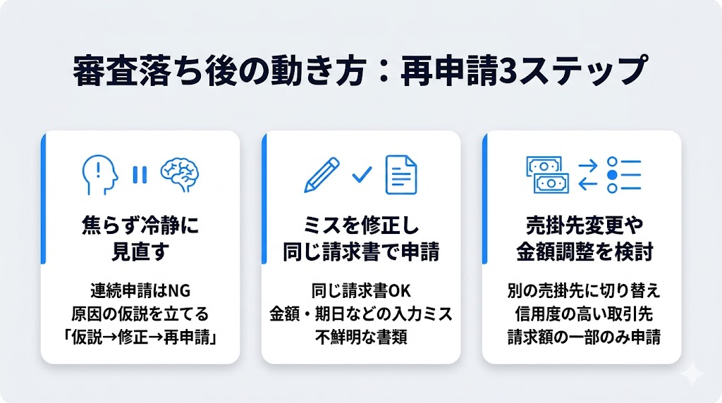 審査落ちの通知を受けた後に最もやってはいけないのが、原因を特定しないまま焦って連続申請することです。ここでは、通過率を高める具体的な再申請の進め方を3ステップで整理します。