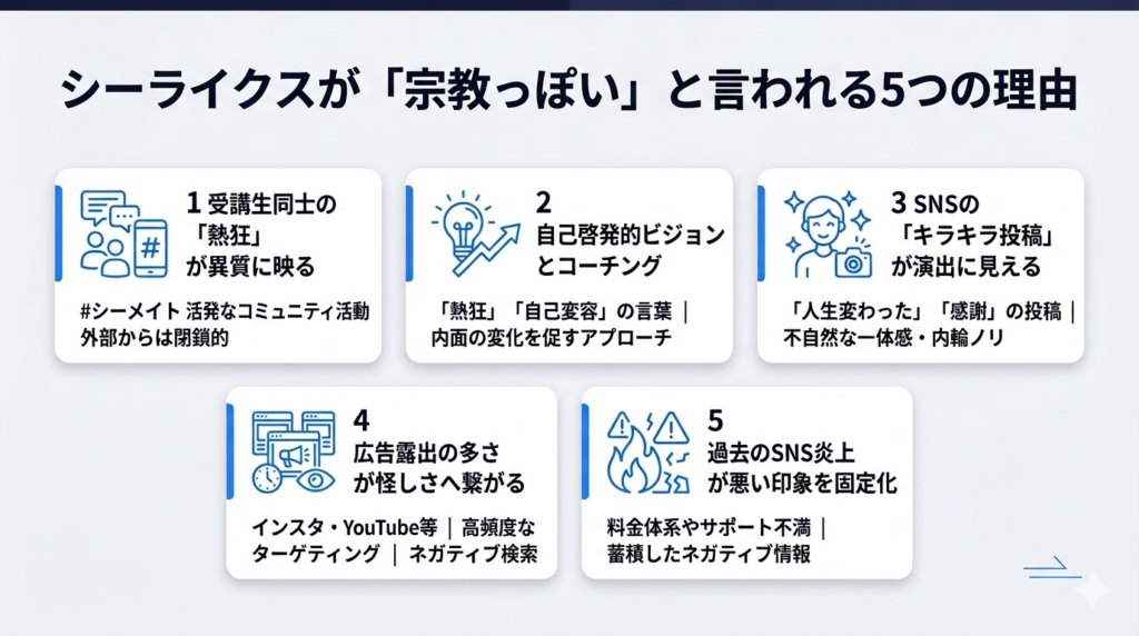 受講者にとってはモチベーション維持の手段ですが、シーライクスを知らない外部の人から見ると、特定の集団に属する人たちが一斉に同じ話題で盛り上がっているように映ります。この「内部では自然だが外部からは閉鎖的に見える」構造が、宗教的な印象につながりやすい要因のひとつです。