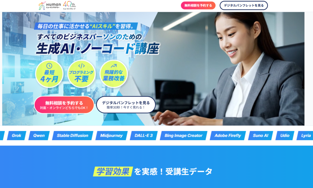 ヒューマンアカデミー|補助金対応で幅広いAIツールを習得