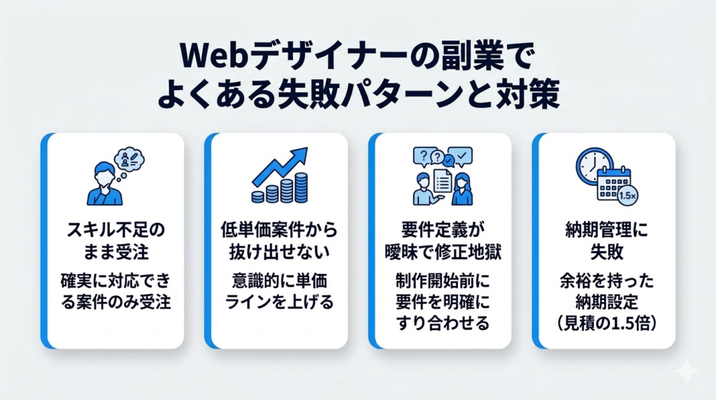副業で案件を受注し始めた後に、多くの方が共通して陥る失敗パターンがあります。ここでは代表的な4つのケースと、それぞれの具体的な対策を解説します。