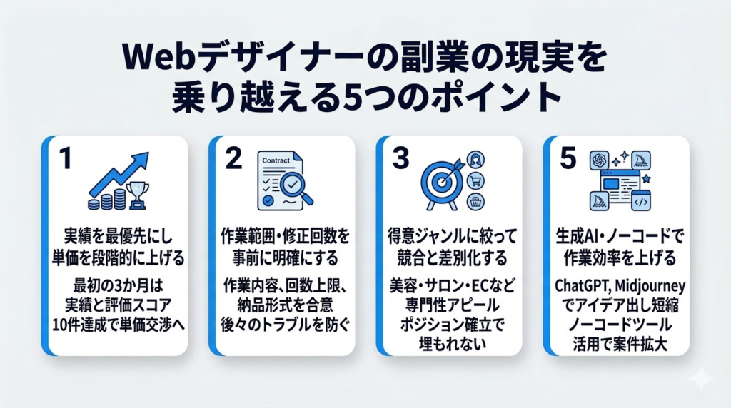 厳しい現実の中でも、戦略的にアプローチすれば副業Webデザイナーとして着実に成果を出すことは可能です。ここでは実践的な5つのポイントを紹介します。