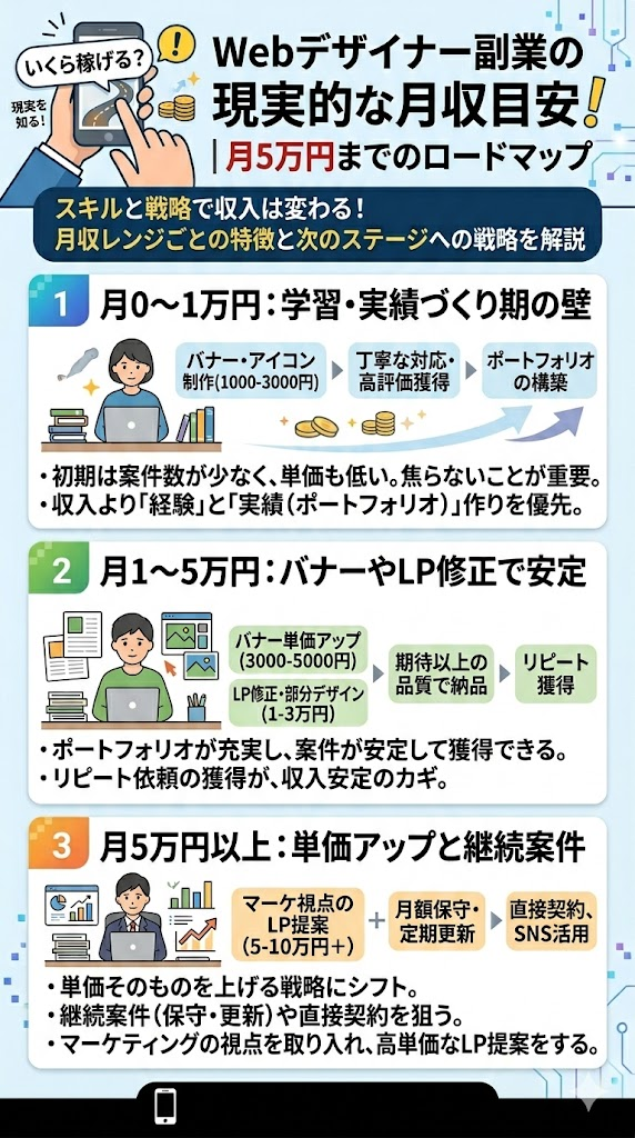 実績が10件前後たまり、ポートフォリオが充実してくると、バナー制作の単価が3,000円〜5,000円に上がったり、LP修正やWebサイトの部分的なデザイン案件(1万円〜3万円)を受注できるようになります。月に数件の案件を安定して獲得できれば、月収1万円〜5万円のレンジに入ります。